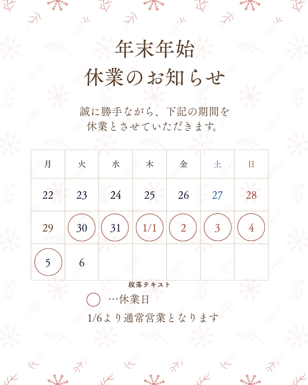 年末年始の定休日とさせていただきます。